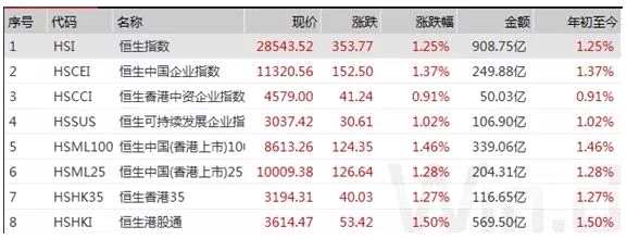 港股同樣迎來“開門紅”,行業(yè)板塊集體開花,藍籌權重紛紛上揚,賺錢效應明顯。截至收盤,恒指漲1.25%報28543.52點,創(chuàng)去年7月25日以來新高,國企指數(shù)漲1.37%,紅籌指數(shù)漲0.91%。全日大市成交908.75億港元。