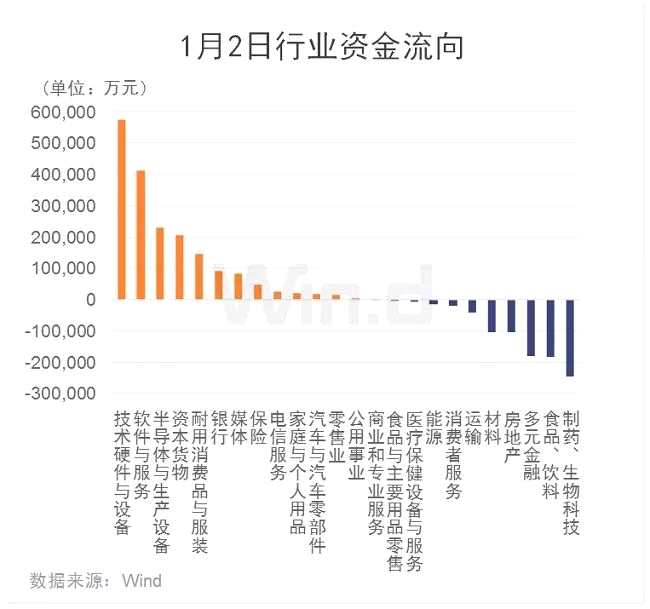 從周四行業(yè)主力資金流向來看,主力資金凈流入近100億元。其中,技術硬件與設備凈流入超50億元,位居第一;軟件與服務緊隨其后,凈流入超40億元,半導體、資本貨物板塊凈流入亦超20億元??梢?,主力資金再度回補科技板塊。生物制藥、食品飲料、多元金融等板塊凈流出額較多。