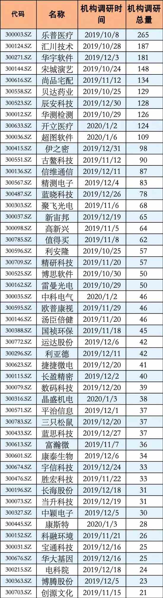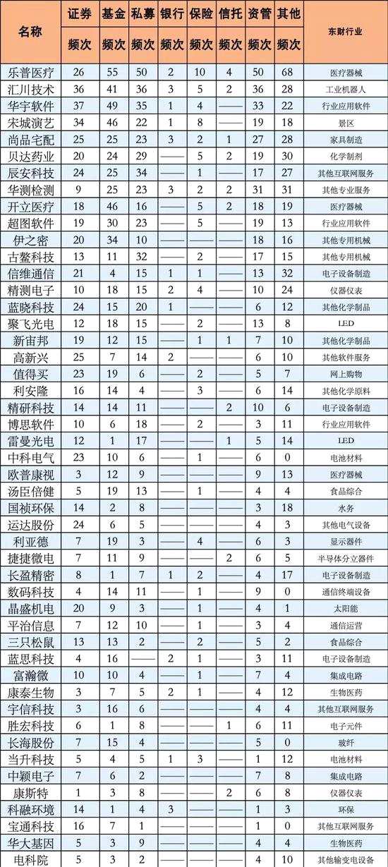 除上述個(gè)股外,金融1號(hào)院截取金融機(jī)構(gòu)近三個(gè)月調(diào)研次數(shù)較多的創(chuàng)業(yè)板個(gè)股TOP50,供投資者參考: