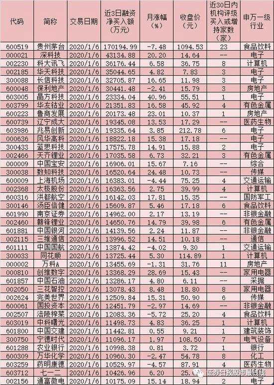 記者根據(jù)同花順數(shù)據(jù)統(tǒng)計(jì)發(fā)現(xiàn),1月2日至1月6日的3個交易日里,滬深兩市共有1077只兩融標(biāo)的股實(shí)現(xiàn)融資凈買入,其中累計(jì)融資凈買入額超1億元的兩融標(biāo)的股達(dá)到41只,貴州茅臺(17.02億元)、【深科技(000021)、股吧】(4.31億元)、科大訊飛(3.62億元)、華天科技(3.50億元)、長信科技(3.27億元)、保利地產(chǎn)(3.04億元)、晶方科技(2.33億元)、華友鈷業(yè)(2.14億元)和魯商發(fā)展(2.02億元)等9只個股期間累計(jì)融資凈買入額均達(dá)到2億元以上。另外,包括遼寧成大、兆易創(chuàng)新、風(fēng)華高科(維權(quán))、藍(lán)思科技、天齊鋰業(yè)、中國寶安等在內(nèi)的32只個股期間累計(jì)融資凈買入額均達(dá)到或超過1億元,上述41只個股合計(jì)融資凈買入額達(dá)到86.53億元。