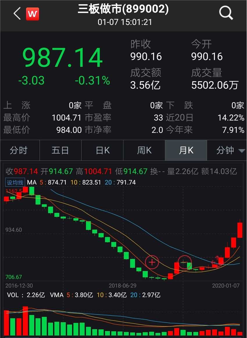 1月7日,雖然三板做市指數(shù)未能守住1000點(diǎn),但從月線看,已收獲了七連陽。