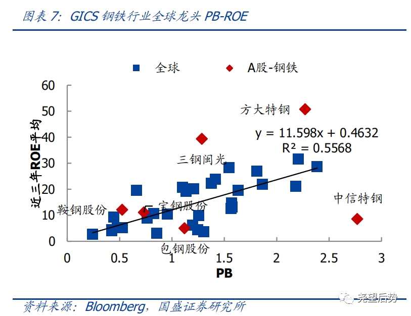 對于估值水平判斷:根據(jù)全球各周期行業(yè)龍頭,計算A股龍頭估值與盈利匹配偏離度,偏離度越大,估值吸引力越強。具體方法是:選取某個行業(yè)全球市值前30龍頭作為樣本,計算其ROE和PB的線性擬合曲線;A股選取各行業(yè)市值前六作為行業(yè)龍頭,根據(jù)線性擬合曲線和A股龍頭的ROE和PB計算得到A股龍頭距離直線的距離,定義為龍頭估值與盈利匹配的偏離度,向上偏離度越大,說明估值吸引力越強。