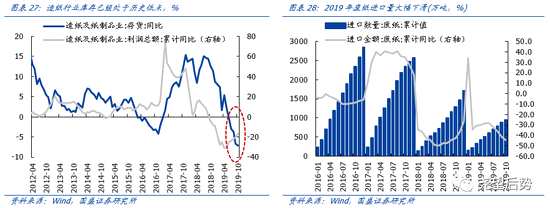 造紙:2017年底至今兩年時(shí)間,造紙行業(yè)經(jīng)歷了主動(dòng)及被動(dòng)去庫存的情況,當(dāng)前行業(yè)庫存已經(jīng)處于歷史低點(diǎn),未來或迎來補(bǔ)庫存階段。另一方面,隨著進(jìn)口廢紙政策持續(xù)趨嚴(yán),廢紙審批額度大幅下滑,2020年廢紙缺口或進(jìn)一步擴(kuò)大,疊加庫存位于底部,國內(nèi)廢紙纖維量供應(yīng)不足,或?qū)?dǎo)致國廢價(jià)格上漲,并帶動(dòng)成品紙價(jià)格上漲。