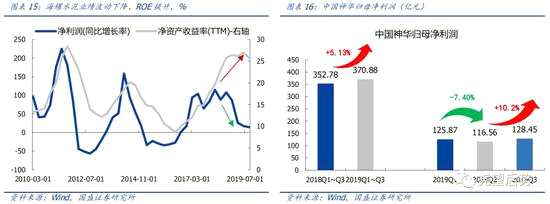 而以中國神華為代表的大多周期龍頭,估值尚未迎來修復(fù)。公司在煤炭、電力、鐵路、港口等領(lǐng)域皆為行業(yè)翹楚,具有極強(qiáng)競爭力。受益于“煤電化路港航”全產(chǎn)業(yè)鏈的協(xié)同效應(yīng)和縱向一體化優(yōu)勢(shì),即使在煤價(jià)下行周期中,業(yè)績底部依然明確,19Q3單季凈利潤創(chuàng)近 6 年新高,抵御風(fēng)險(xiǎn)能力強(qiáng)勁。公司充?,F(xiàn)金流、低估值、高分紅,但估值仍處低位。未來類似中國神華的周期龍頭也或迎來估值的“撥亂反正”。