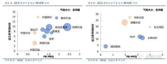 從 PB-ROE 角度,對(duì)比兩國周期龍頭估值水平。A 股龍頭估值相對(duì)較低,部分盈利更優(yōu),尤其是能源、建材、建筑、地產(chǎn)行業(yè)。便于兩國對(duì)比,采取 GICS 行業(yè)分類。