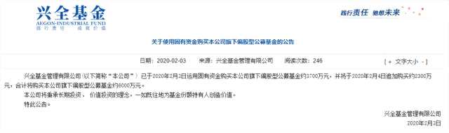 2月3日,興全基金官網(wǎng)發(fā)布《關(guān)于使用固有資金購(gòu)買本公司旗(金麒麟分析師)下偏股型公募基金的公告》,公告顯示,興全基金已于2020年2月3日運(yùn)用固有資金購(gòu)買旗下偏股型公募基金約3700萬(wàn)元,并將于2020年2月4日追加購(gòu)買約2300萬(wàn)元,合計(jì)將購(gòu)買本公司旗下偏股型公募基金約6000萬(wàn)元。