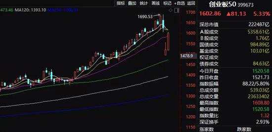 首先從指數(shù)來(lái)看,A股三大指數(shù)全線上漲,其中創(chuàng)業(yè)板的相關(guān)指數(shù)漲幅巨大,接近收復(fù)失地。而且成交量顯著放大,顯示市場(chǎng)流動(dòng)性緊張的情況在很大程度上已經(jīng)緩解。