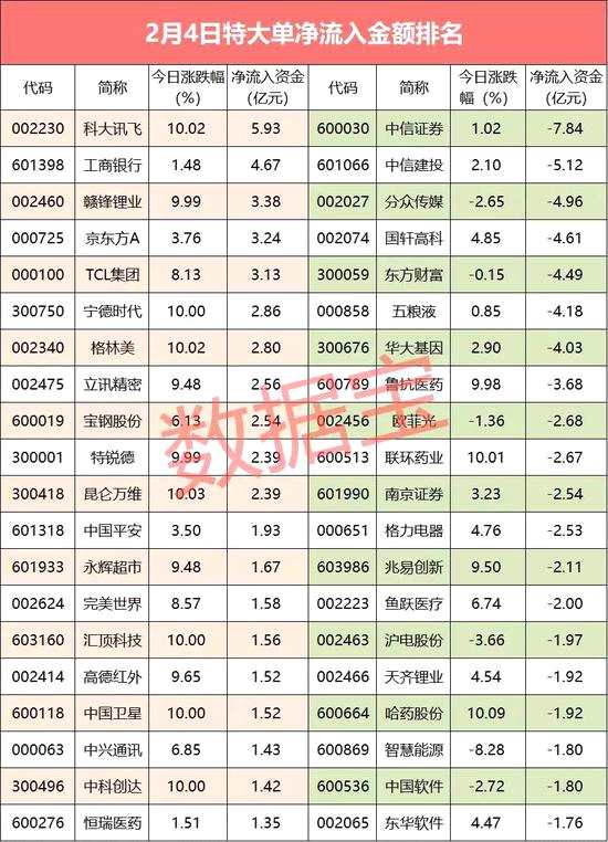 兩市特大單資金凈流出156.49億元,多只抗流感概念股資金大幅流出,醫(yī)藥行業(yè)合計流出38億元。多只特斯拉概念股流入金額較高。