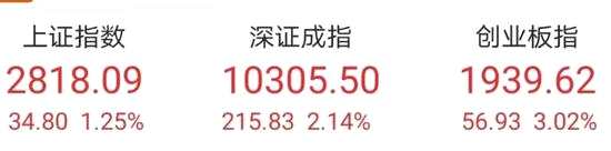 截至收盤,兩市沖高后稍有回落,滬指漲1.25%報(bào)2818.09點(diǎn),成交3492億元;深成指漲2.14%報(bào)10305.50點(diǎn),成交5231億元。創(chuàng)業(yè)板指上漲3.02%,報(bào)1939.62點(diǎn)。