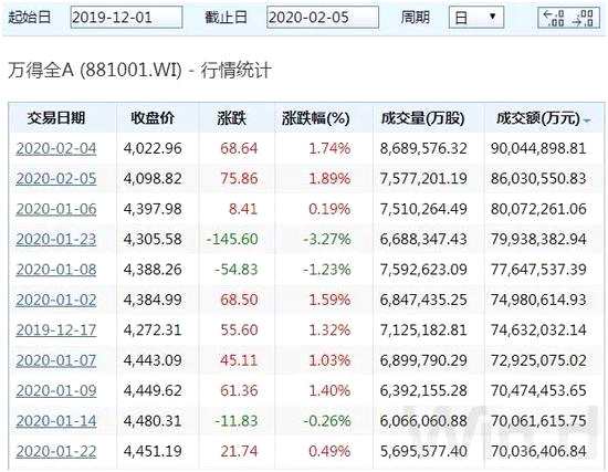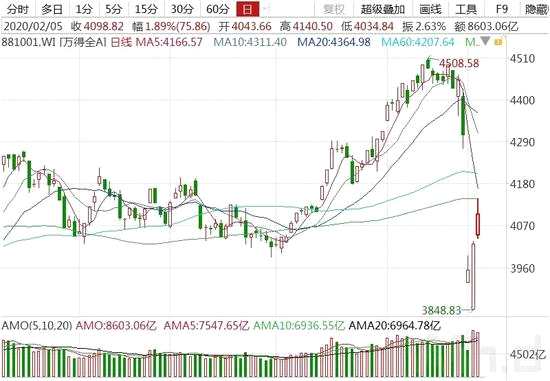成交額是衡量走勢的一個重要指標,去年12月以來,A股放量拉升,連續(xù)多個交易日維持在6000億元-7000億元的水平,量價配合完美。鼠年首個交易日,因疫情影響,A股跳空大跌,但隨后兩個交易日,資金大舉進場掃貨,2月4日,萬得全A成交金額突破9000億元,創(chuàng)去年12月以來新高,2月5日,萬得全A成交金額達8600多億元,緊隨其后。連續(xù)兩日放量拉升,可見抄底資金來勢洶洶。