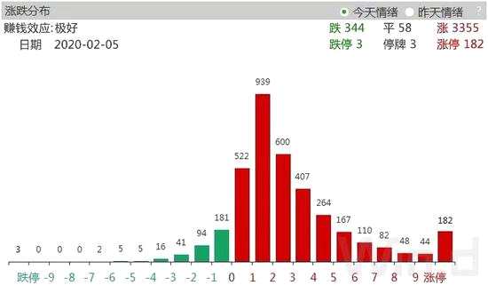 截至2月5日收盤,滬深兩市大幅上漲,從個股表現(xiàn)來看,因信心修復(fù),也迎來普漲行情,上漲個股有3300多家,漲停股達182家。下跌個股僅有300多家。從漲幅分布來看,漲幅超過2%的近2000家,投資者情緒高漲。