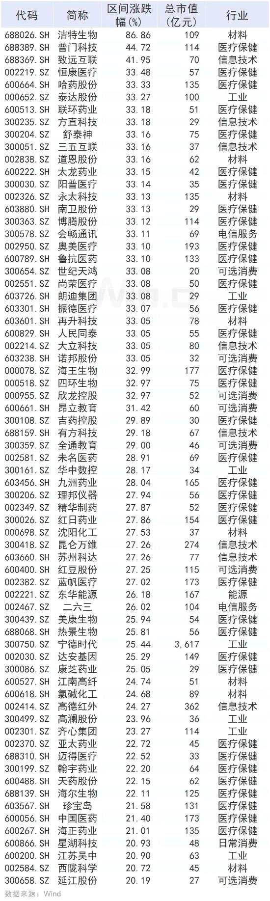從具體漲幅來看,有69家公司漲幅超過20%,其中科創(chuàng)板公司【潔特生物(688026)、股吧】三天漲幅超過80%,普門科技、致遠互聯(lián)、恒康醫(yī)療、哈藥股份、泰達股份、聯(lián)環(huán)藥業(yè)等公司漲幅亦超過30%,且漲幅超過20%的多為醫(yī)療保健板塊公司。(剔除1月之后上市非科創(chuàng)板公司及2月份上市公司)