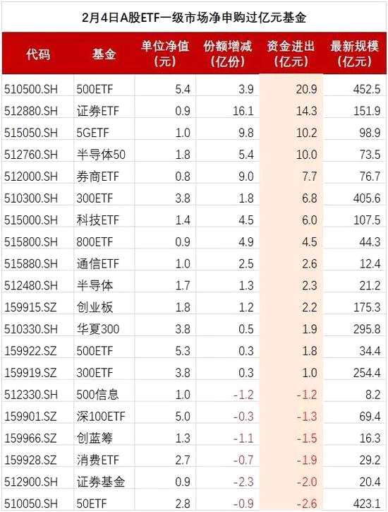 Wind數(shù)據(jù)顯示,2月4日,市場上A股ETF共212只,當日份額凈增加46.19億份,乘以相應(yīng)基金當日單位凈值,以此估算A股ETF一級市場獲得70.22億元凈申購。其中凈申購過億元的基金有14只,500ETF、證券ETF、5GETF、半導(dǎo)體50凈申購超10億元。另外有6只A股ETF凈贖回過億元,其中50ETF凈贖回2.6億元。