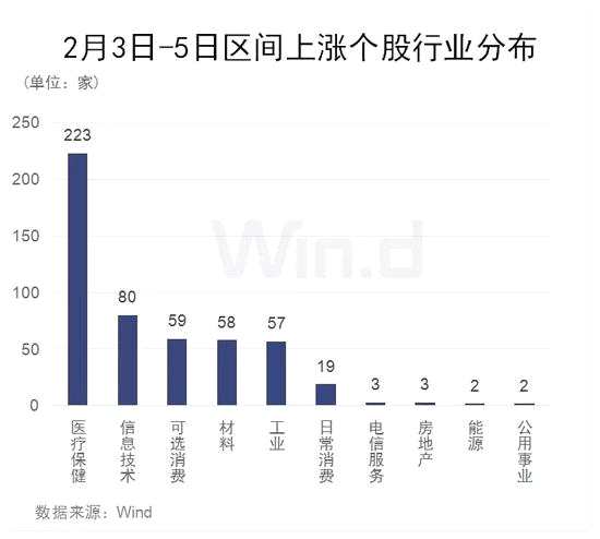 由于2月4日、5日連續(xù)兩日A股大漲,雖然2月3日跌幅較大,但已有數(shù)百家公司成功收復(fù)失地。Wind統(tǒng)計顯示,近三日,有506家公司累計上漲,從相關(guān)公司行業(yè)分布來看,醫(yī)療保健當仁不讓位居首位,有223家公司;信息技術(shù)亦有80家公司;可選消費、材料、工業(yè)均有50多家公司。