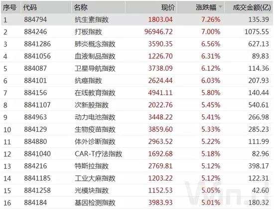 巨量成交下,市場熱點紛呈,Wind概念板塊中,抗生素、肺炎、衛(wèi)星導(dǎo)航、在線教育等10多個板塊漲幅超過5%。
