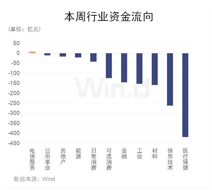 從本周行業(yè)資金流向來看,累計凈流出1300多億元,其中醫(yī)療保健板塊凈流出最多,超過400億元,信息技術(shù)凈流出250億元緊隨其后,材料、工業(yè)、金融、可選消費等板塊凈流出金額亦較多,僅電信服務(wù)小幅凈流入。