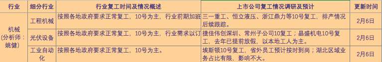 機械行業(yè)及3個細分行業(yè)復工情況匯總如下: