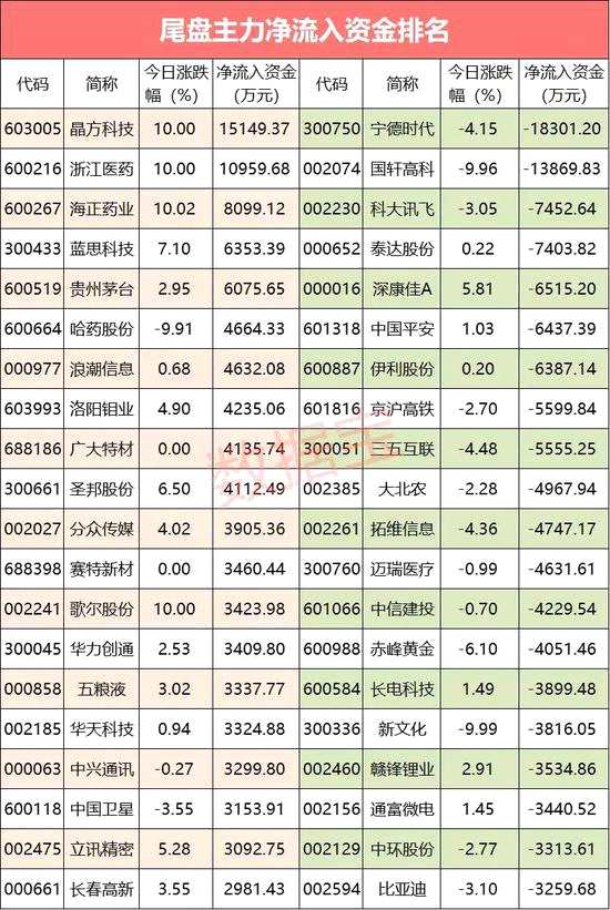 尾盤個股流入超億元的2只個股,分別是晶方科技、浙江醫(yī)藥,尾盤均收于漲停。值得關(guān)注是,尾盤多只醫(yī)藥股資金回流,海正藥業(yè)流入超8000萬元,哈藥股份、長春高新、人福醫(yī)藥均有較高的流入。尾盤資金流出超億元的也有2只,均為鋰電池個股,分別為寧德時代、國軒高科。此外,科大訊飛、泰達股份流出金額超7000萬元。