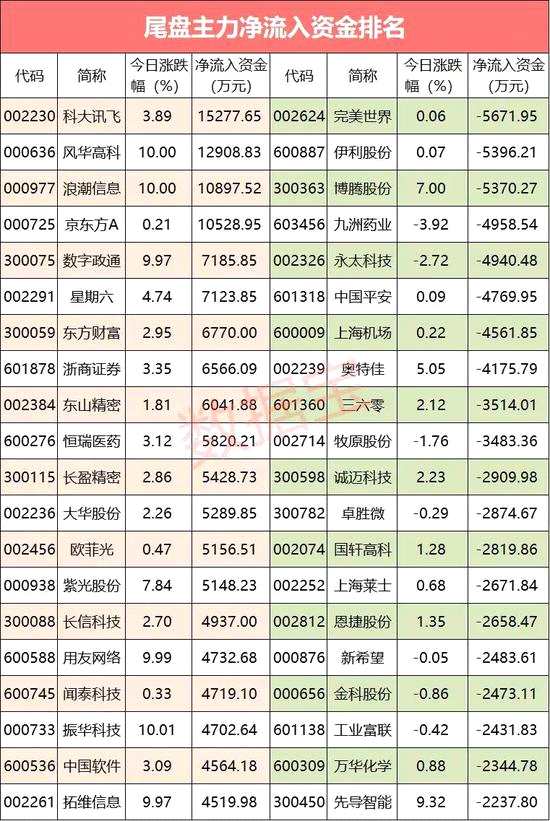 尾盤個股流入超億元的個股有4只,分別是科大訊飛、風華高科(維權(quán))、浪潮信息、京東方A。另外,數(shù)字政通、星期六、東方財富等流入超5000萬元。尾盤無一個股流出超億元,流出金額較高的有完美世界、伊利股份、博騰股份,三股尾盤流出均超5000萬元。