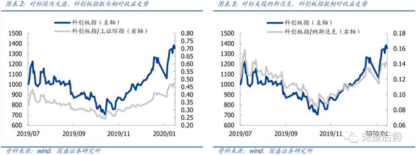 對(duì)標(biāo)海內(nèi)外市場,科創(chuàng)板相對(duì)收益小幅回落。對(duì)標(biāo)國內(nèi)大盤,科創(chuàng)板相對(duì)收益周內(nèi)小幅出現(xiàn)小幅震蕩并小幅回落,截至2月14日收盤,科創(chuàng)板指/上證綜指達(dá)到0.46。對(duì)標(biāo)海外科技創(chuàng)新企業(yè)云集的納斯達(dá)克市場,科創(chuàng)板相對(duì)收益也在周內(nèi)呈現(xiàn)“V”字走勢,截至2月14日收盤,科創(chuàng)板指/納斯達(dá)克指數(shù)與上周基本持平,維持在0.14。