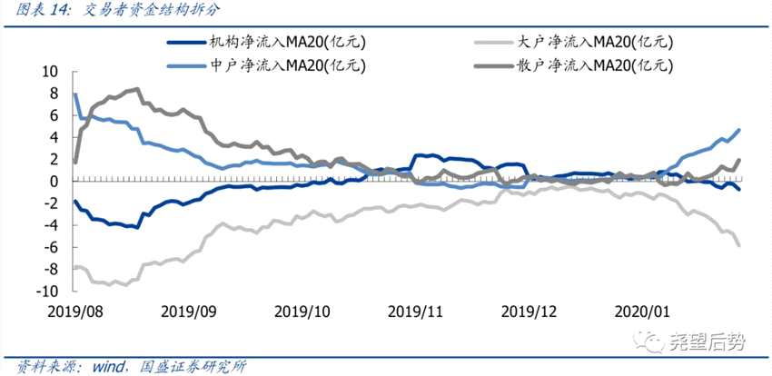 科創(chuàng)板成交額再度回升,中小戶主導(dǎo)流入,機(jī)構(gòu)與大戶主導(dǎo)流出。本周科創(chuàng)板累計(jì)成交額1290.41億元,較上周增加173.74億元,環(huán)比提升15.56%。科創(chuàng)成交額占A股成交額比例周內(nèi)震蕩提升,截至2月14日收盤,占比達(dá)到3.28%。從交易者結(jié)構(gòu)來看,本周中戶凈流入20日均線繼續(xù)抬升,而大戶凈流入20日均線的流出態(tài)勢則繼續(xù)加深,同時(shí)機(jī)構(gòu)與散戶流入流出也開始呈現(xiàn)背離,成交活躍度持續(xù)提升,其中中小戶主導(dǎo)流入,而機(jī)構(gòu)與大戶主導(dǎo)流出。