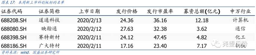 本周科創(chuàng)板IPO新增4家。2020年2月10日-2020年2月14日,科創(chuàng)板共計(jì)4家公司成功上市,分別為廣大特材(688186.SH)、【賽特新材(688398)、股吧】(688398.SH)、映翰通(688080.SH)和道通科技(688208.SH)。四家企業(yè)分別屬于鋼鐵、化工、通信和計(jì)算機(jī)行業(yè),募資總額分別為7.17億元、4.82億元、3.62億元和12.18億元。