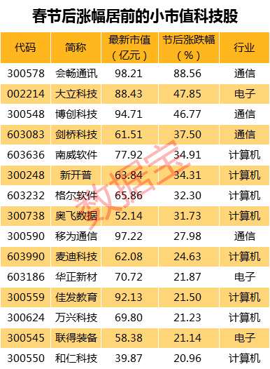 整體來看,上述小市值科技股整體表現(xiàn)不俗,春節(jié)以來平均漲幅近16%,同期創(chuàng)業(yè)板指漲幅僅13%,上證指數(shù)漲幅不足2%。