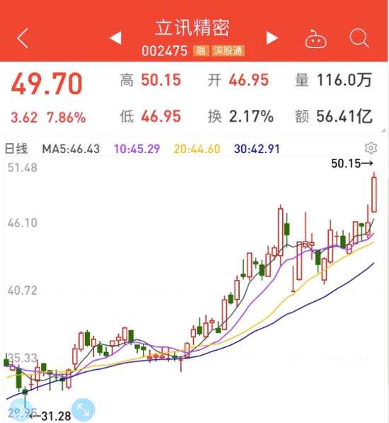 消費(fèi)電子龍頭之一的立訊精密今日再度創(chuàng)出歷史新高。截至收盤,該股收?qǐng)?bào)49.7元,盤中及收盤均創(chuàng)出歷史新高。此外,匯頂科技、華天科技等科技龍頭今日也打破歷史最高記錄,萬潤(rùn)股份、【臥龍電驅(qū)(600580)、股吧】、恒生電子等科技股突破階段新高。
