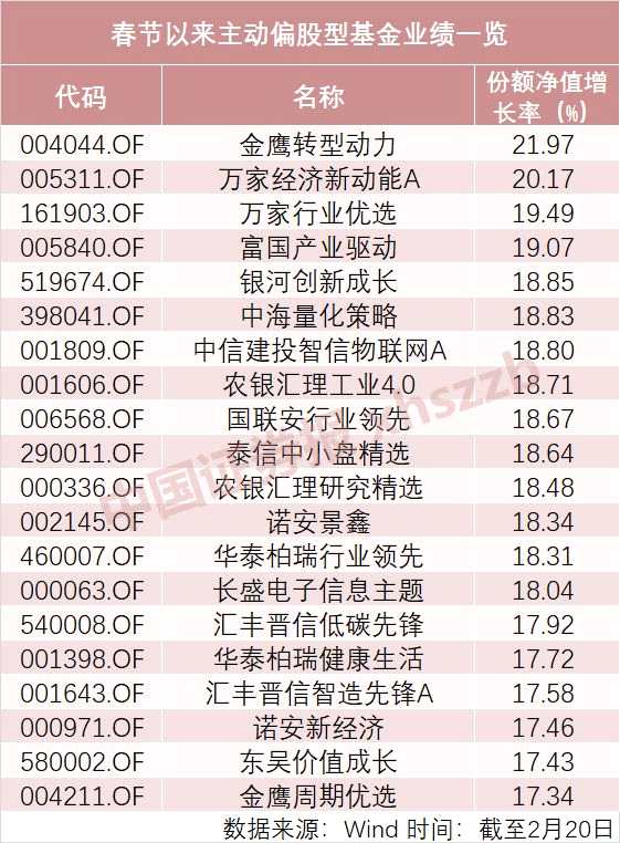 位居主動偏股型基金第一的是金鷹轉型動力,自2月3日以來份額凈值增長率達21.97%;萬家經濟新動能A和萬家行業(yè)優(yōu)選緊隨其后,份額凈值增長率分別為20.17%和20.13%。