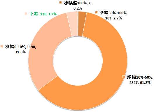 在這一統(tǒng)計區(qū)間里,A股的3765只股票中(2020年2月3日之前上市),3627只股票上漲,占比達96.3%。