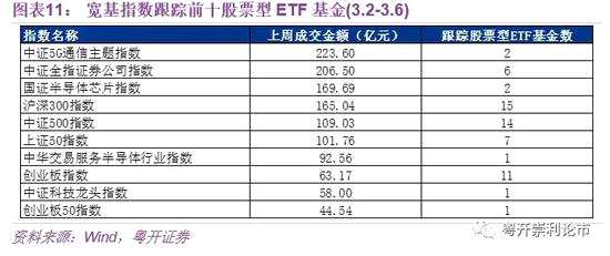 從股票型ETF基金跟蹤指數(shù)來看,上周(3.2-3.6)各跟蹤指數(shù)成交額之和前三的ETF基金分別為中證5G通信主題指數(shù)(223.6億元,共2只ETF基金)、中證全指證券公司指數(shù)(206.50億元,共6只ETF基金)、國證半導(dǎo)體芯片指數(shù)(169.69億元,共2只ETF基金)。科技、大中盤、創(chuàng)業(yè)板相關(guān)概念指數(shù)為成交量較多指數(shù)。