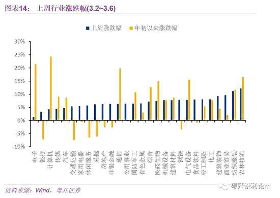 上周全行業(yè)上漲,后期看好基建、金融等相關(guān)投資主題。上周漲幅前五行業(yè)分別為農(nóng)林牧漁(12.17%)、紡織服裝(11.28%)、商業(yè)貿(mào)易(9.64%)、建筑裝飾(9.26%)、化工(8.10%)。近期受海外市場波動的影響,國內(nèi)市場呈震蕩走勢,此階段值得關(guān)注的投資方向包括:第一、“新基建”概念,“新基建”在近期重要會議中屢被提及,在資本市場的熱度也不斷上升,包括5G、特高壓、城際城軌、新能源充電樁、工業(yè)互聯(lián)網(wǎng)、大數(shù)據(jù)中心、人工智能七大科技主題的基建主題;第二、券商主題,今年券商ETF成交活躍,2019年以來,多個政策的出臺使券商行業(yè)迎來全面利好,資本市場朝著更加完善、市場化的方向發(fā)展。