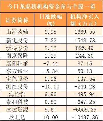 盤后龍虎榜數(shù)據(jù)顯示,機(jī)構(gòu)現(xiàn)身12股,其中山河藥輔等6股呈現(xiàn)機(jī)構(gòu)資金凈買入,欣旺達(dá)等6股呈現(xiàn)機(jī)構(gòu)資金凈賣出。