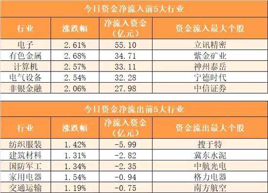 28個(gè)申萬(wàn)一級(jí)行業(yè)中,22個(gè)行業(yè)實(shí)現(xiàn)資金凈流入,其中電子行業(yè)凈流入55.1億元居首。