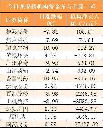 盤后龍虎榜數(shù)據(jù)顯示,機構現(xiàn)身14股,其中集泰股份1只股票呈現(xiàn)機構資金凈買入,國藥股份等13股呈現(xiàn)機構資金凈賣出。