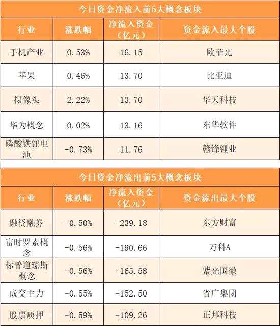 概念板塊方面,今日手機產業(yè)、蘋果、攝像頭、華為概念等概念板塊資金呈現(xiàn)凈流入,其中手機產業(yè)概念凈流入16.15億元居首。