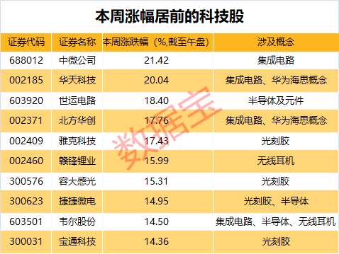 以今日午盤收盤價來算,光刻膠、集成電路、無線耳機、智能音箱、半導體及華為海思概念為主的213只科技股本周整體跑贏大盤,本周漲幅居前的科技股有中微公司、華天科技、【世運電路(603920)、股吧】、北方華創(chuàng)、雅克科技等,漲幅均超過15%。