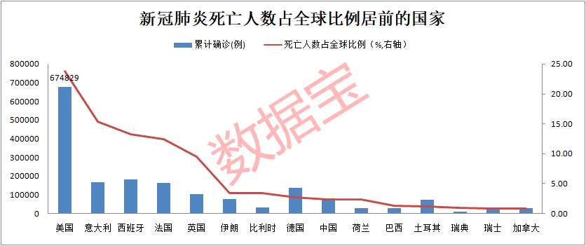 全球累計死亡14.5萬例,死亡率達到6.67%。僅美國累計死亡人數(shù)就達到了34475例,占全球死亡人數(shù)比例超過兩成,意大利、西班牙等3國家的死亡人數(shù)占比均超過了一成。