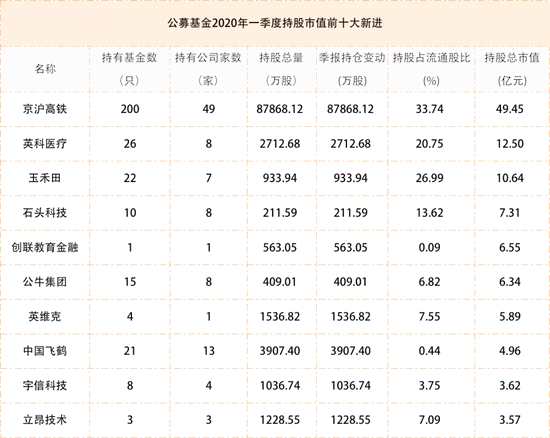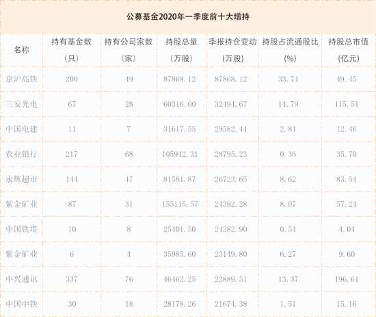 此外,從公募基金一季度持股市值前十大重倉情況來看,京滬高鐵憑借被200只基金新進(jìn)前十大重倉,以及8.79億股的增持排在新進(jìn)增持榜首位。