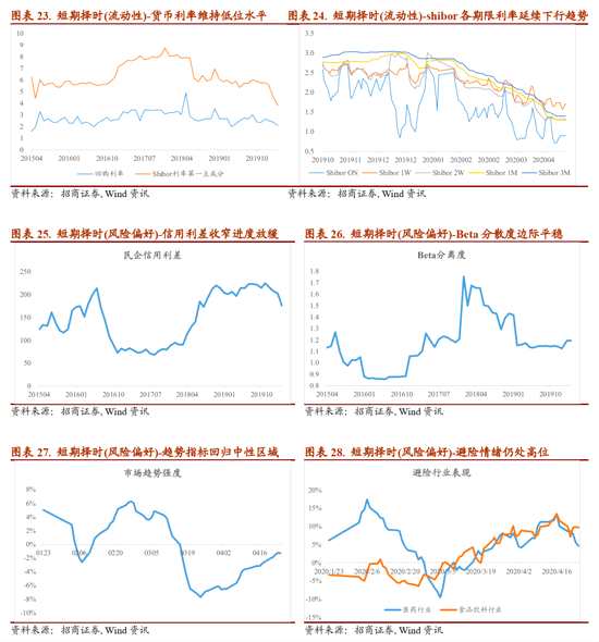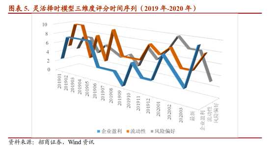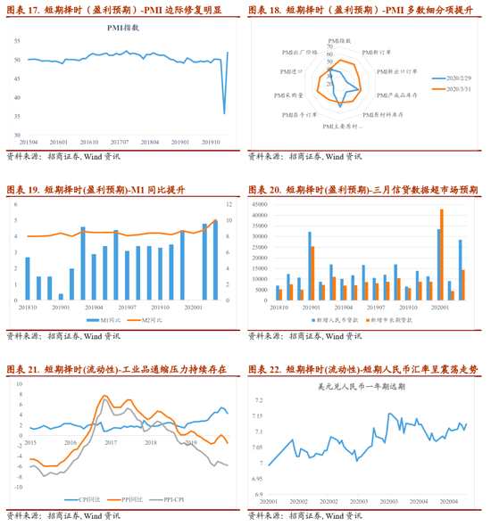 從短期(月度)維度來(lái)看,當(dāng)前靈活擇時(shí)模型中,風(fēng)險(xiǎn)偏好評(píng)分持續(xù)處于低位,盈利預(yù)期和流動(dòng)性評(píng)分仍處于較高水平。在企業(yè)盈利層面,多維度數(shù)據(jù)表明未來(lái)企業(yè)盈利邊際修復(fù)的概率明顯增大,一方面從PMI數(shù)據(jù)來(lái)看,3月底更新的數(shù)據(jù)表明PMI總指數(shù)包括反映需求的PMI新訂單指數(shù)都明顯轉(zhuǎn)暖,另一方面從信貸數(shù)據(jù)來(lái)看,無(wú)論新增人民幣貸款還是其中新增的中長(zhǎng)期貸款,3月同比增速都顯著提升,反映企業(yè)信貸需求的快速修復(fù),企業(yè)盈利預(yù)期的邊際修復(fù)對(duì)市場(chǎng)維持階段性將提供提振;在流動(dòng)性層面,貨幣市場(chǎng)利率維持寬松狀態(tài),無(wú)風(fēng)險(xiǎn)利率的持續(xù)下行依然有利于呵護(hù)市場(chǎng)估值,但是伴隨海外新興市場(chǎng)風(fēng)險(xiǎn)事件的爆發(fā),美元指數(shù)再度走強(qiáng)對(duì)人民幣匯率造成一定壓制;需要警惕的依然來(lái)自風(fēng)險(xiǎn)偏好層面,可以觀察到市場(chǎng)情緒評(píng)分自四月以來(lái)一直維持在偏低水平,我們跟蹤的情緒指標(biāo)民營(yíng)企業(yè)的信用利差邊際再次擴(kuò)大,市場(chǎng)趨勢(shì)依然偏弱,同時(shí)結(jié)構(gòu)上醫(yī)藥、食品飲料等行業(yè)的相對(duì)強(qiáng)勢(shì)也反映出市場(chǎng)投資者的避險(xiǎn)心態(tài),市場(chǎng)情緒的降溫對(duì)短期市場(chǎng)仍有負(fù)面影響。