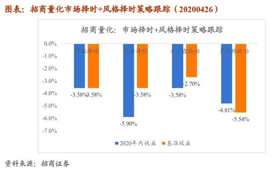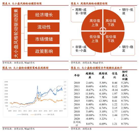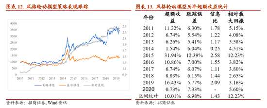 當(dāng)前行業(yè)板塊輪動(dòng)模型對(duì)四月A股市場(chǎng)的板塊推薦超配金融和消費(fèi)板塊,考慮到擇時(shí)模型對(duì)市場(chǎng)的觀點(diǎn)為中性,在行業(yè)配置層面強(qiáng)調(diào)攻守平衡,且從絕對(duì)收益的角度當(dāng)前金融地產(chǎn)板塊的估值已有明顯安全邊際,即使市場(chǎng)下行該板塊大概率能有超額收益。2020年以來(lái)行業(yè)板塊輪動(dòng)模型的收益為-4.81%,比較基準(zhǔn)中證800的收益為-5.54%,相對(duì)基準(zhǔn)的超額收益為0.30%。2019年風(fēng)格輪動(dòng)模型組合收益為52.24%,比較基準(zhǔn)中證800的收益為35.69%,相對(duì)基準(zhǔn)實(shí)現(xiàn)了16.55%的超額收益。
