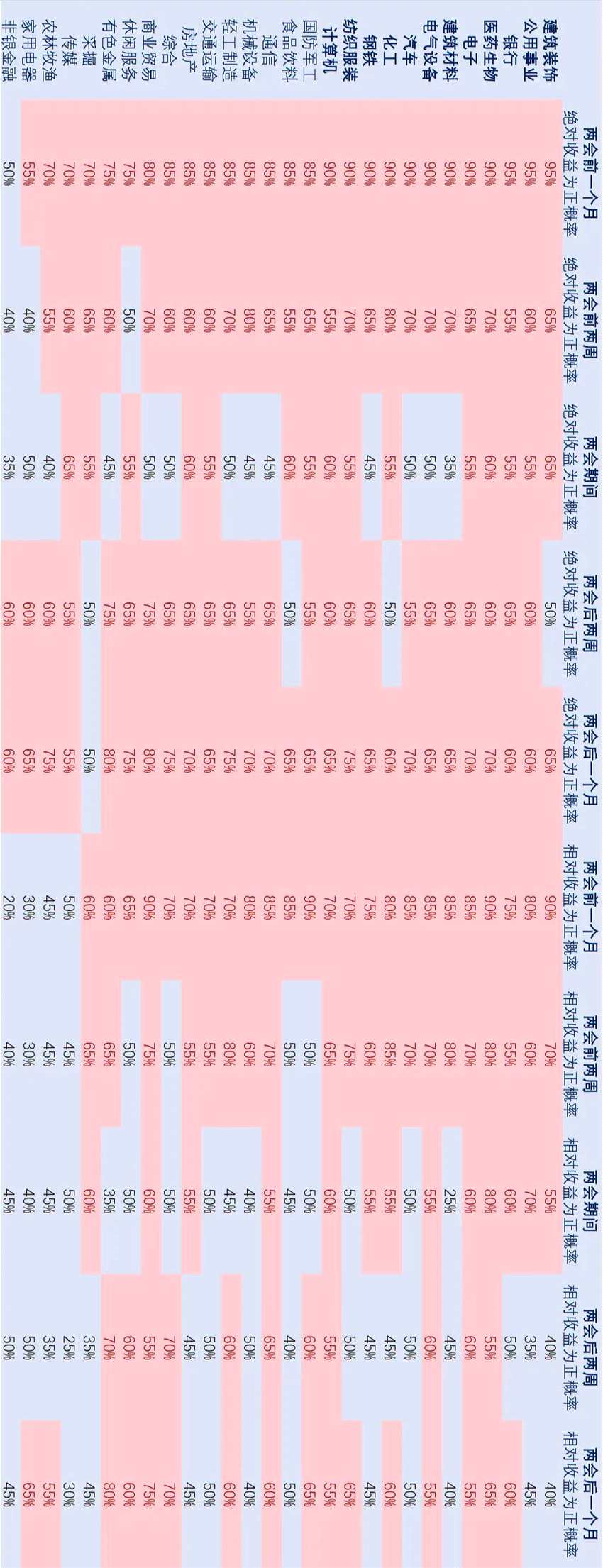 從行業(yè)板塊來看,在兩會前一月至兩會期間,醫(yī)藥生物板塊表現(xiàn)尤為突出,而在兩會后一個月內(nèi),有色金屬跑贏上證綜指的概率領先各行業(yè)板塊。在兩會前一個月,建筑裝飾、醫(yī)藥生物、國防軍工及商業(yè)貿(mào)易相對收益為正的概率均高達90%;在兩會前兩周,醫(yī)藥生物、建筑材料及輕工制造跑贏上證綜指的概率均為80%;在兩會期間,醫(yī)藥生物相對收益為正的概率仍保持在80%,是各行業(yè)板塊中最高的;在兩會后兩周,綜合板塊和有色冶煉加工概念相對收益為正的概率均為70%,超過其它行業(yè)板塊;在兩會后一個月,有色金屬概念收益率超過上證綜指的概率為80%,保持領漲態(tài)勢。