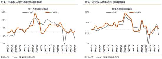 中小板:得益于農(nóng)業(yè)和電子的拉動,增速表現(xiàn)優(yōu)于其他板塊。中小板20Q1營收增速-8.9%,較19Q4的7.3%下滑16.2個百分點(diǎn);凈利潤增速-17.2%,較19Q4的-0.8%下滑16.4個百分點(diǎn)。中小板指表現(xiàn)更為突出:20Q1凈利潤增速-0.7%,較19Q4的1.3%回升0.5個百分點(diǎn),主要來自牧原、正邦、【大北農(nóng)(002385)、股吧】等農(nóng)業(yè)股,以及歐菲光、立訊等電子股的貢獻(xiàn)。