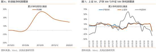 結(jié)論:全部A股剔除金融/兩油/四大航,凈利潤下滑36.5%;中小板得益于農(nóng)業(yè)和電子的拉動,增速優(yōu)于其他板塊;創(chuàng)業(yè)板20Q1凈利潤增速-27.5%,創(chuàng)業(yè)板指(剔除溫氏)為-15.9%,創(chuàng)50為-0.8%,頭部指數(shù)顯著更好;科創(chuàng)板收入負(fù)增長,利潤正增長,但利潤總額僅28億;指數(shù)凈利潤增速,上證50>滬深300>中證500,藍(lán)籌指數(shù)抗風(fēng)險(xiǎn)性突出。
