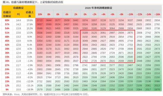 往后三個季度,逐季修復(fù)的盈利增速,意味著指數(shù)點(diǎn)位可能也是震蕩且底部小幅抬升。一方面,由于貨幣寬松(預(yù)計(jì)下半年邊際收緊),使得估值有一定支撐;另一方面,疫情沖擊下盈利的修復(fù)進(jìn)度也存在著不確定性,全年看盈利增速小幅下滑但季度逐季修復(fù)。基于這兩點(diǎn),我們對估值和盈利做出情形假設(shè),并進(jìn)一步測算對應(yīng)的上證綜指點(diǎn)位矩陣圖。如下圖紅色框所示,2020年在盈利-10%至0、估值分位30%至50%的假設(shè)下,上證綜指的點(diǎn)位多數(shù)分布在2600-3000之間(2020年)。