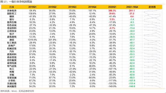 全部A股:無懸念的負(fù)增長,剔除金融/兩油/四大航,凈利潤下滑36.5%。20Q1全部A股營收增速-8.8%,較19Q4的8.7%下滑17.4個百分點(diǎn);凈利潤增速-24%,較19Q4的6.4%下滑30.4個百分點(diǎn)。疫情及國際油價(jià)暴跌的影響下,中石油/中石化+海航/國航/南航/東航,一季度合計(jì)虧損近600億,占到非金融A股利潤總額的25%左右。全部A股(非金融非兩油四大航) 20Q1的凈利潤增速-36.5%,較19Q4的-1.8%下滑34.7個百分點(diǎn)。