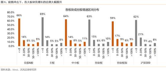從增速區(qū)間分布看,各板塊負(fù)增長的比例創(chuàng)歷史之最,均在60%以上;而高增速(>100%)的比例也降至歷史低位。甚至滬深300成份股負(fù)增長的比例也有62%,而創(chuàng)業(yè)板指負(fù)增長比例59%,略好于板塊整體。疫情沖擊下,多數(shù)企業(yè)盈利無差異都要面臨一定的損失。