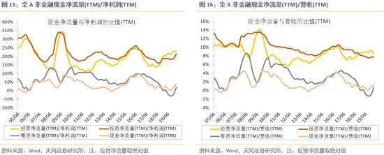 20Q1現(xiàn)金流有改善,但主要來自籌資現(xiàn)金流的大幅增加,經(jīng)營現(xiàn)金流有明顯惡化,而投資現(xiàn)金流也未見明顯擴(kuò)張。2020年一季報(bào),全部A股非金融公司現(xiàn)金凈流量為-1154億,同比去年增加2620億,現(xiàn)金流情況邊際好轉(zhuǎn)。其中,經(jīng)營現(xiàn)金凈流量同比去年減少4865億(經(jīng)營現(xiàn)金流入大幅減少),投資凈流量同比去年增加430億(投資現(xiàn)金流出小幅增加),籌資凈流量同比去年大幅增加6734億(籌資現(xiàn)金流入大幅增加)。可見,現(xiàn)金流的改善主要來自籌資現(xiàn)金的增加,這背后是一季度政策發(fā)力下新增社會融資規(guī)模再創(chuàng)歷史新高,M2增速重回兩位數(shù)區(qū)間。