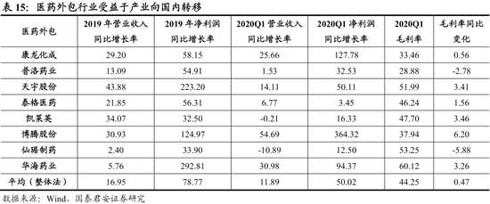 醫(yī)藥外包產(chǎn)業(yè)鏈受益于我國創(chuàng)新藥行業(yè)發(fā)展及產(chǎn)業(yè)向國內(nèi)轉(zhuǎn)移,景氣度有望長期延續(xù)。我們選取的8家醫(yī)藥外包產(chǎn)業(yè)鏈公司2020Q1營收同比增長12%,扣非凈利潤同比增長50%。CRO產(chǎn)業(yè)鏈的康龍化成、泰格醫(yī)藥,特色原料藥行業(yè)的普洛藥業(yè)、博騰股份(維權(quán))等Q1盈利均快速增長。短期看行業(yè)需求旺盛,中期看我國創(chuàng)新藥行業(yè)快速發(fā)展和產(chǎn)業(yè)轉(zhuǎn)移將使景氣周期長期維持。
