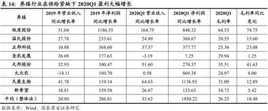 養(yǎng)殖行業(yè)在供給緊缺下2020Q1盈利大幅增長,年內(nèi)供給缺口仍較大,景氣度有望持續(xù)。我們選取的8家養(yǎng)殖公司2020Q1營收同比增長34%,扣非凈利潤同比增長19倍。疫情進一步加大了生豬、肉雞等行業(yè)的供給缺口。豬肉價格同比大幅上漲,牧原股份、正邦科技等龍頭盈利顯著提升。由于當前種豬中三元母豬占比較高,且三元母豬淘汰率高,疊加疫情沖擊,我國生豬產(chǎn)能恢復將更加漫長,行業(yè)景氣有望持續(xù)。在豬肉的較大缺口下,作為替代品的白羽肉雞行業(yè)景氣周期也有望拉長。